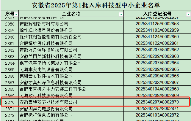 近日,安徽省科学技术厅公布了2025年第一批入库科技型中小企业名单,安徽誉特双节能技术有限公司凭借其在节能技术领域的突出创新实力和丰富的技术积累,入选科技型中小企业库,成为安徽省科技创新主力军中的一员。