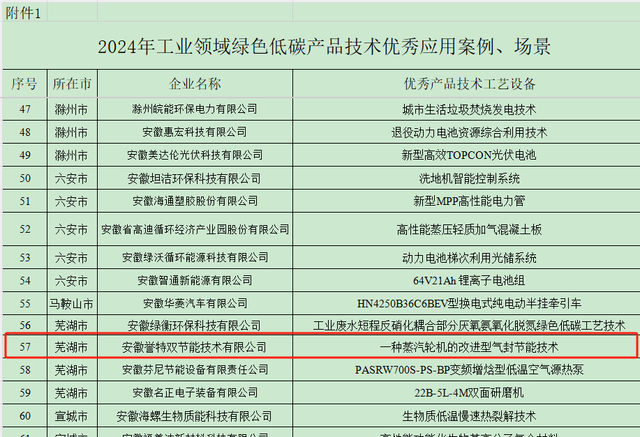 近日,安徽省工信厅为推进新型工业化,加强工业领域绿色低碳技术、装备、产品的推广应用,引导制造业绿色化发展,发布了2024年以来一批绿色低碳产品技术应用推广服务的优秀案例与场景,并引导和支持有关企业加强供需对接和应用,助力工业绿色低碳发展,其中我公司"一种蒸汽轮机的改进型气封节能技术"入选工业领域绿色低碳技术推广目录。